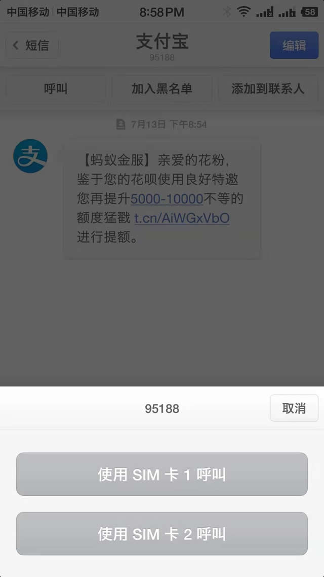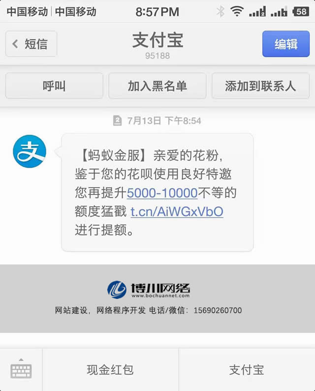 事件是這樣的:晚上8點54分的時候,忽然收到一條來自支付寶的短信,短信內容為花唄的額度提額。