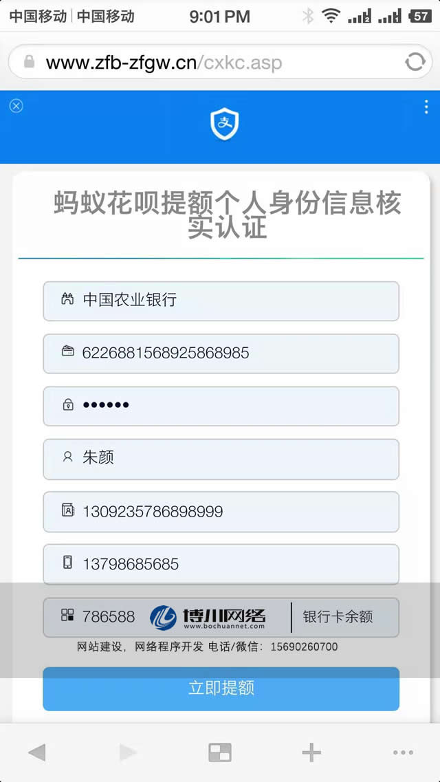 下一個頁面,是更加詳細和更加敏感的個人信息輸入,甚至包括銀行卡密碼和預留手機號!可想而知,如果真的沒加任何防備提交了這些信息,會有多大的風險。博川隨機填寫了一些虛構的信息之后,信息提交之后流程結束。