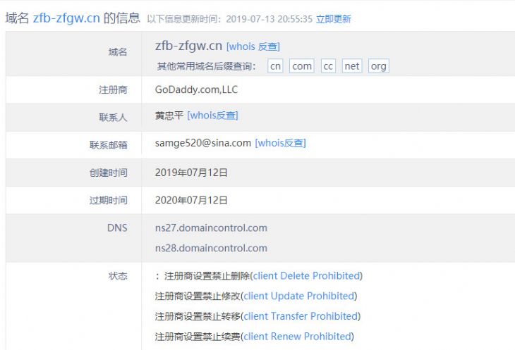 1、大多數人訪問網站沒有注意網址的習慣,這個網站的域名(www.zfb-zfgw.cn)并不是支付寶或者的官方(alipay.com)域名,這也是博川一眼就認定這是虛假網站的原因。查詢域名注冊信息之后發現,果然,這是一個昨天(7月12日)才剛剛注冊的新域名,正常來說一個正規網站涉及到開發、備案、上線測試等多個流程,是不可能注冊后就立即使用的。而且,域名的注冊人為個人,所使用的注冊郵箱也是一個個人新浪郵箱號。像支付寶這樣的公司,是不可能采用這樣不正式的注冊形式的。